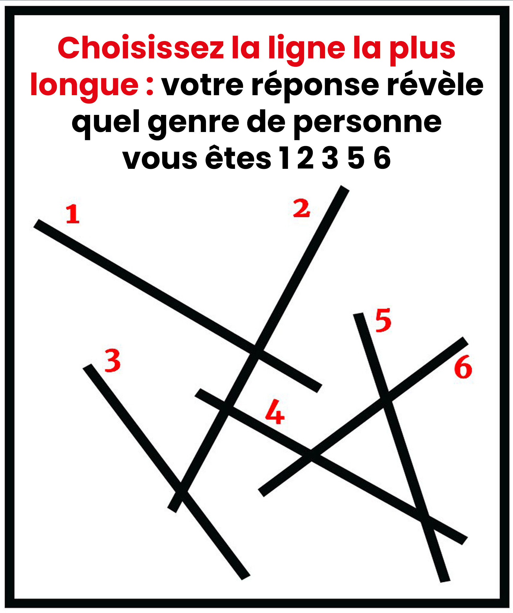À première vue, c’est un petit jeu sans conséquence : six lignes noires, numérotées de 1 à 6, dessinées côte à côte. Votre mission ? Indiquer laquelle vous semble la plus longue. Facile, non ? Et pourtant… derrière ce choix apparemment anodin se cache un test fascinant sur votre perception et votre façon d’aborder la … Lire plus