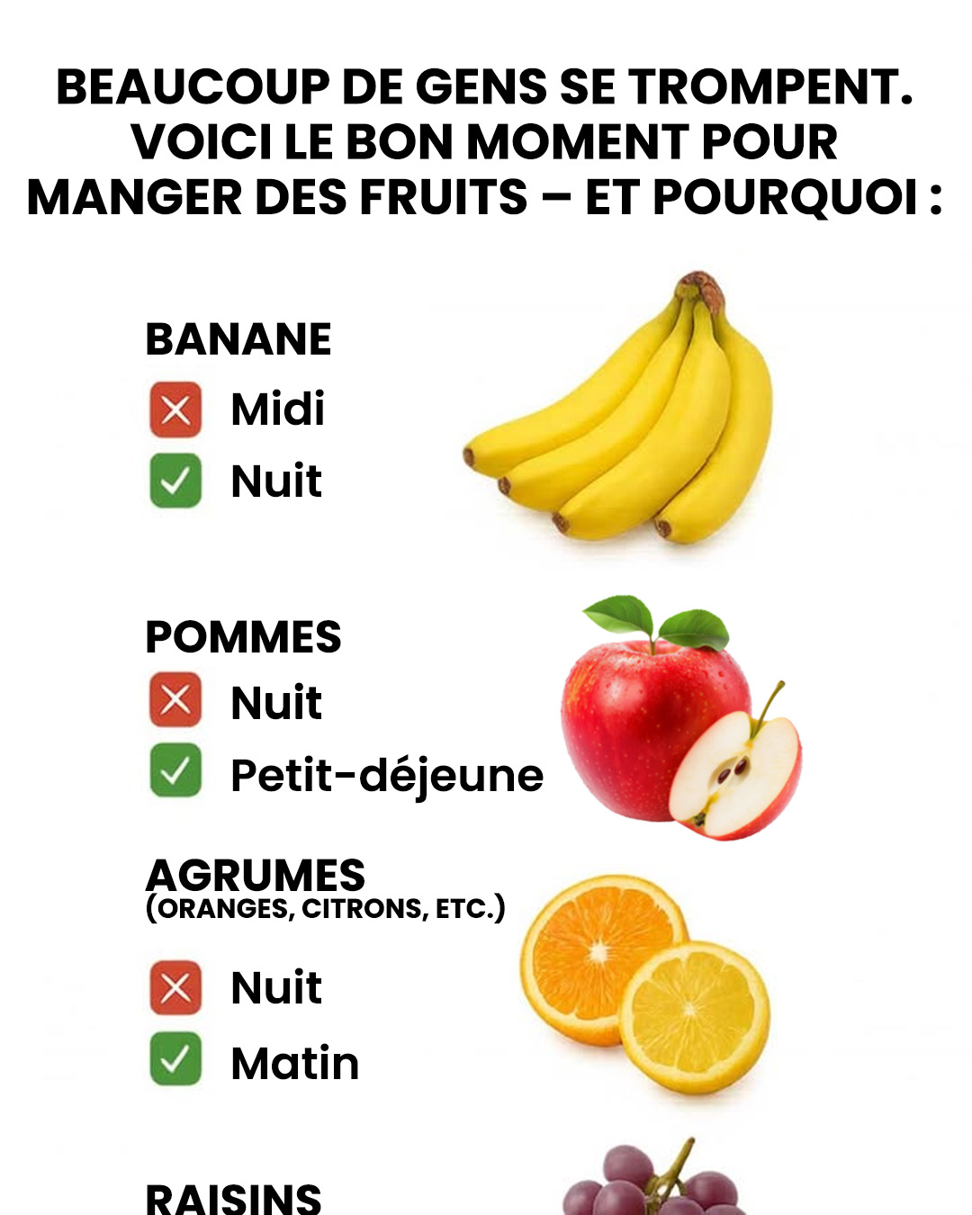 On entend souvent ce conseil : « Mangez 5 fruits et légumes par jour ! » Oui, mais à quel moment de la journée ? Car si les fruits sont excellents pour la santé, leur effet sur la digestion, l’énergie ou le sommeil varie selon l’heure à laquelle on les consomme. Résultat : un fruit bénéfique mal placé dans la journée peut parfois perturber l’organisme. Voici les moments idéaux pour manger 15 fruits courants… et pourquoi cela peut faire la différence.